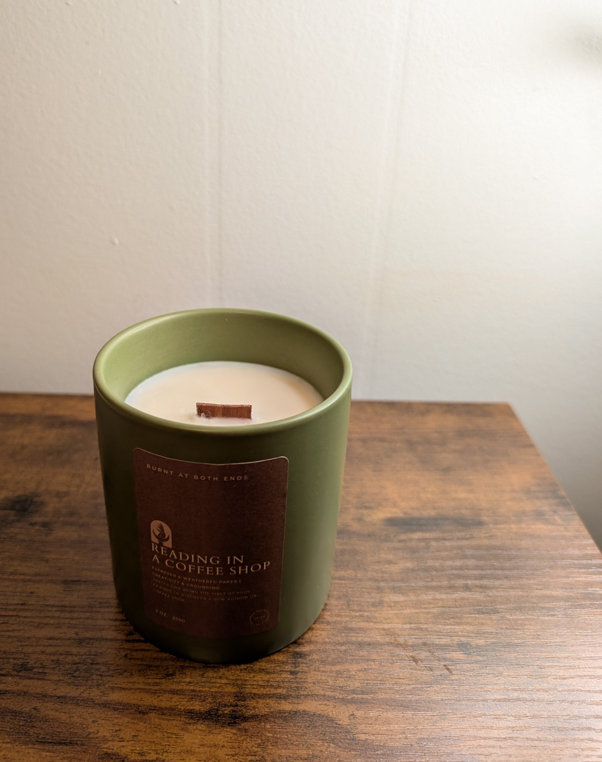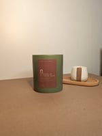 This coconut soy wax candle is 11 ounces. It contains a crackling wood wick and natural fragrance oils, housed in sage ceramic and a bamboo lid.